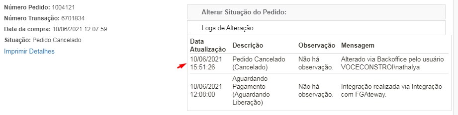 Caso um cliente tenha feito o pedido, não pagou e deseja cancelar, é só alterar o status para “cancelado”, como no exemplo abaixo: