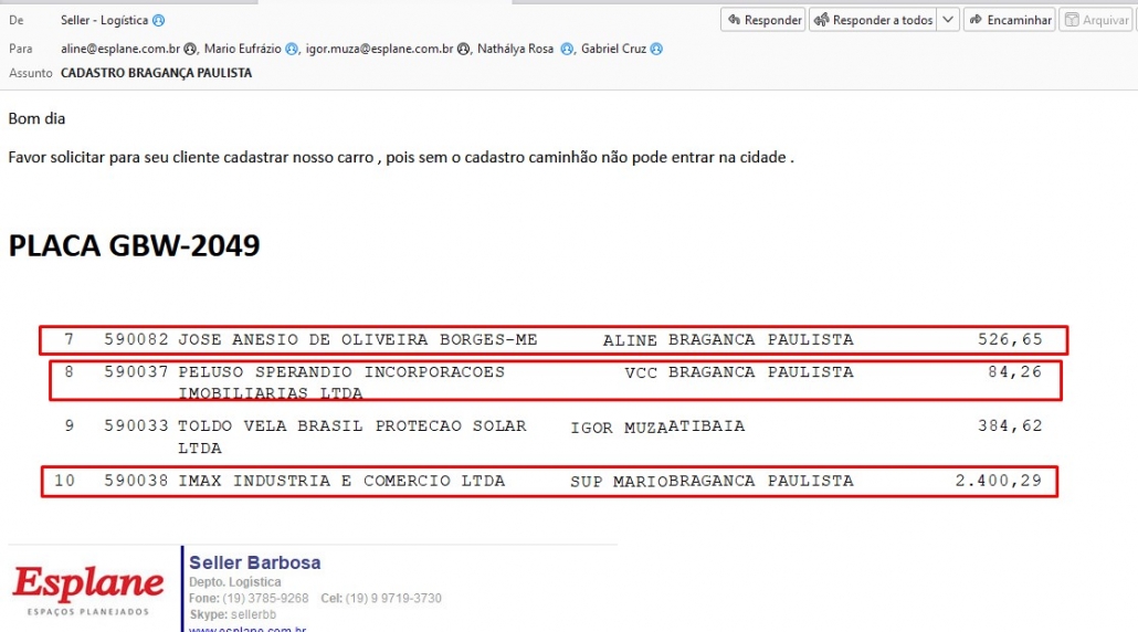Quando necessário, a logística envia um e-mail solicitando o cadastro da placa do veículo que vai circular na cidade de Bragança Paulista, conforme abaixo: