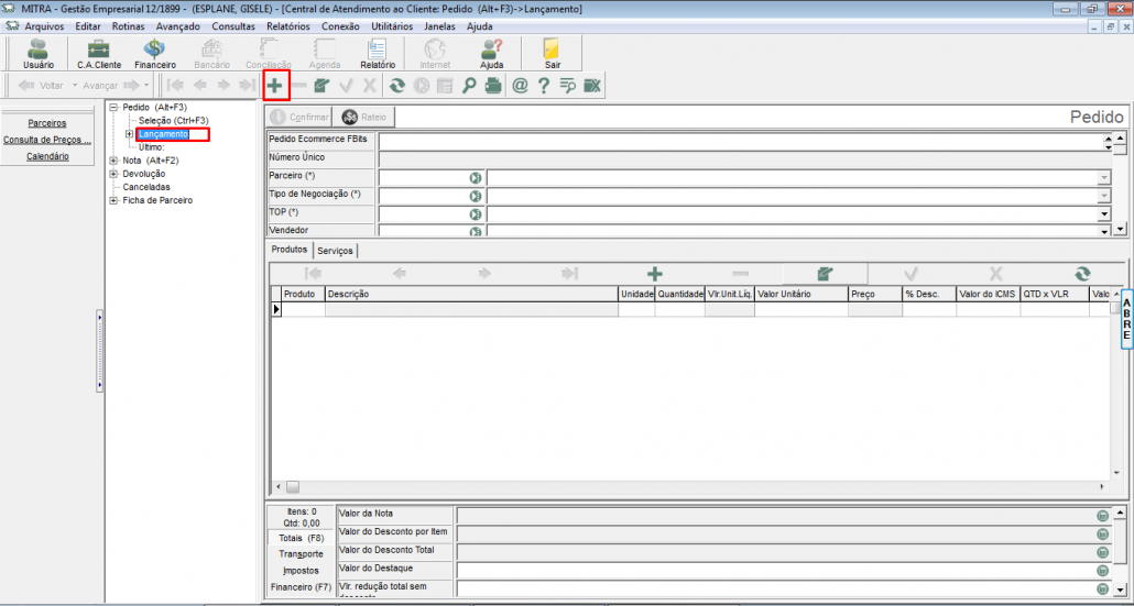 Mitra: CA clientes>lançamento>clicar no icone ‘+’ e dar F2