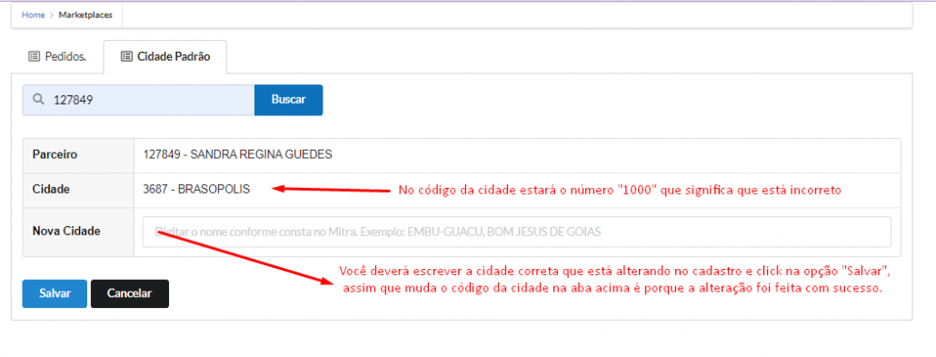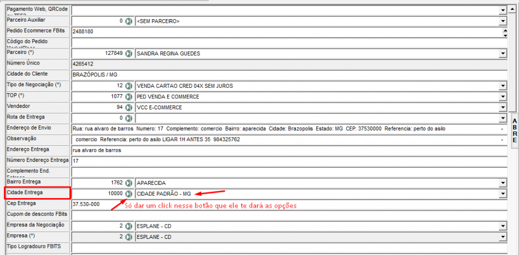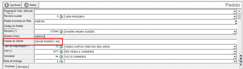 Quando o cliente não coloca corretamente a cidade de entrega e o pedido integra como ‘Cidade Padrão’ pois não conseguiu puxar a cidade certa. Segue o exemplo: