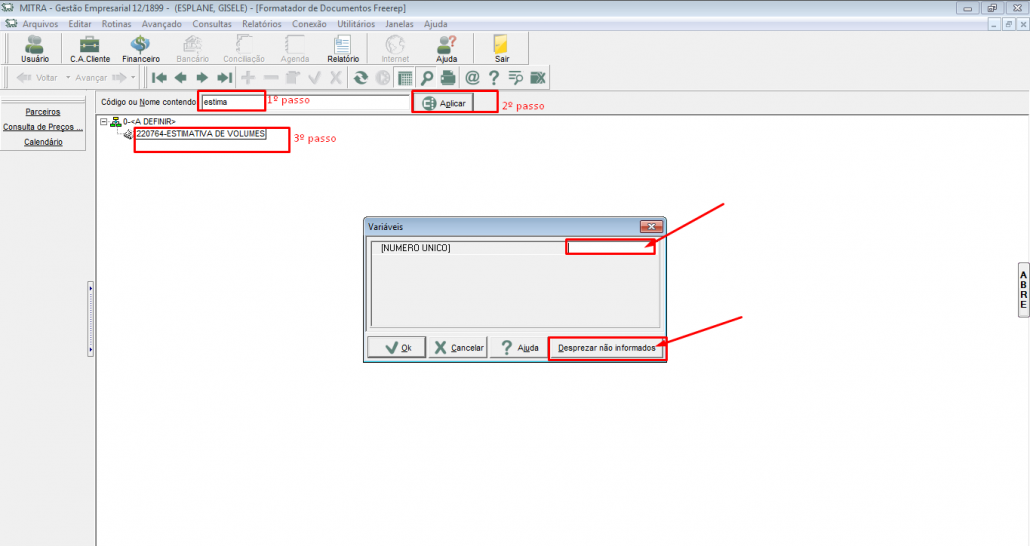 Relatórios>Formatador de documento>código ou nome>aplicar>estima de volume>numero único>desprezar não informados.