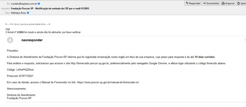 Quando um cliente publica algo em nossa conta do Procon, somos notificados por e-mail (no octa), conforme o exemplo abaixo. Cuidado com e-mail de vírus, o e-mail oficial sempre será assim: