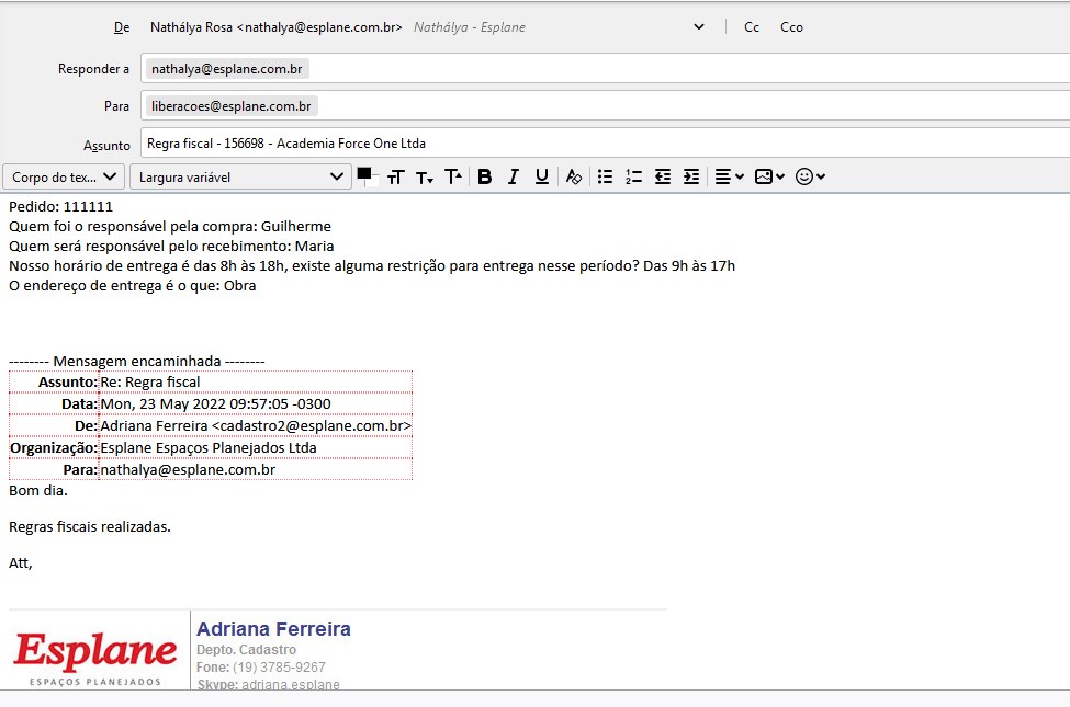 Enviar as informações de PJ e regras para liberacoes@esplane.com.br, incluindo as respostas do questionário e solicitando a liberação do pedido, conforme exemplo abaixo: