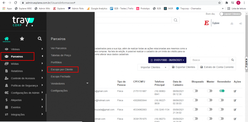 Para saber em qual tabela de preço (parceiro) que o Cliente B2B está cadastrado, devemos acessar “Escopo por Cliente” localizado dentro de “Parceiros”