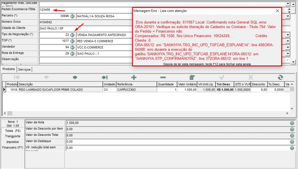 Devemos solicitar um crédito antecipado, somente quando o gerente da logística autoriza, em casos que é de urgência o cliente receber o material, exemplo, está com a obra parada e entregamos material errado e a rota é somente uma vez na semana ou duas vezes. O pedido deve ser feito no mitra, somente com os itens que serão devolvidos pelo cliente, no mesmo valor que será gerado o crédito quando a coleta for feita e no tipo de negociação 23. Quando clicar em confirmar, vai aparecer a mensagem abaixo, pois o cliente não tem crédito disponível: