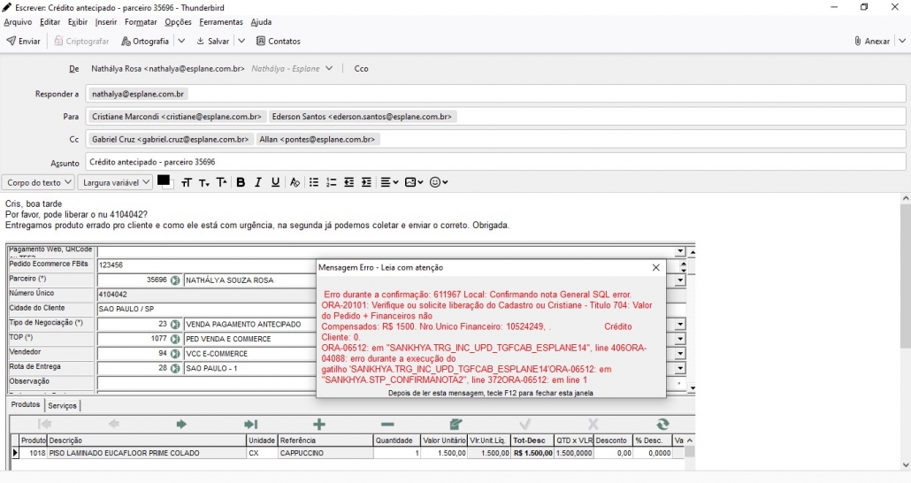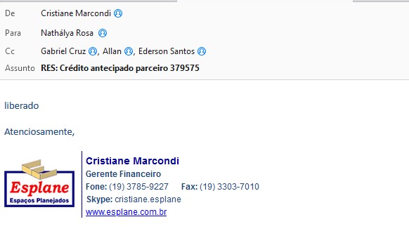 Sendo assim, enviar um e-mail para a Cristiane e Ederson, copiando o gerente da logística e o Allan Pontes, solicitando o crédito antecipado e explicando o motivo, conforme o exemplo abaixo:
