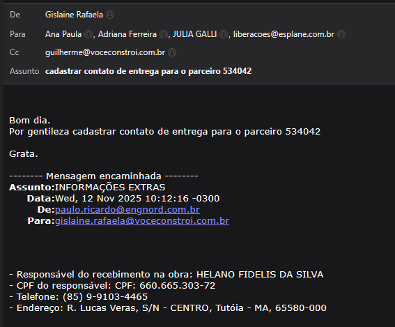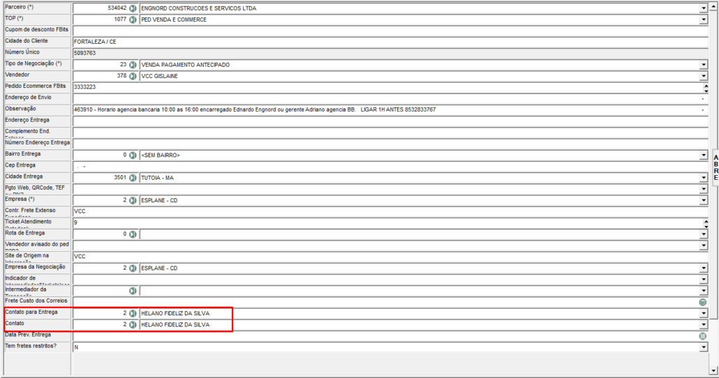 No cabeçalho do pedido, é obrigatório preencher os campos “Contato para entrega” e “Contato”. Somente assim o endereço aparecerá corretamente na Nota Fiscal.