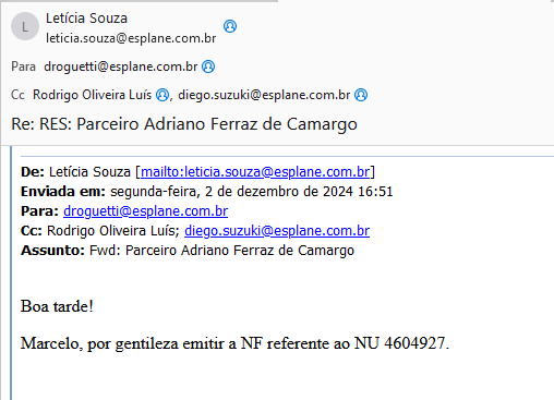Após o confirmar o pedido no Mitra e o cadastro estiver anexo a documentação, enviar por e-mail NU para Droguetti solicitando a emissão da NF.