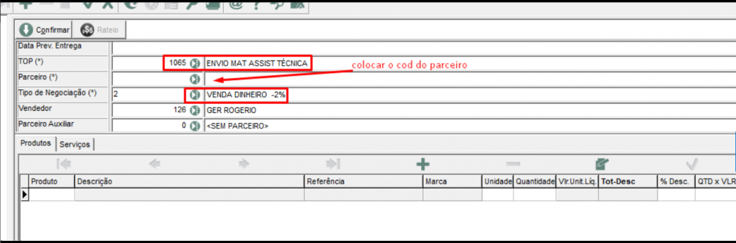 Emitir pedido no Mitra com a TOP 1065 e Tipo de Negociação 2. O restante das informações seguir com os dados do cliente.