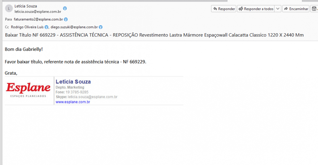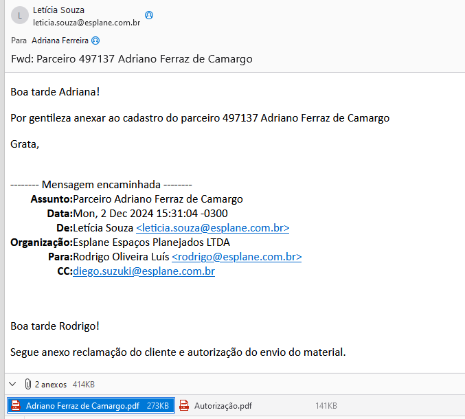 Se tiver documentação, como por exemplo reclamação do cliente e autorização do envio do material, salvar como PDF e enviar por e-mail para o setor de cadastro anexar a documentação no cadastro do cliente: