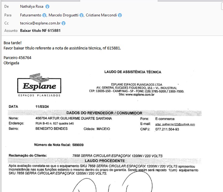 O Marcelo que emite essa nota fiscal. Então, enviar no skype dele solicitando que ele emita a nota fiscal do NU xxxxx e o print do Laudo informando que foi procedente e deve ser enviado o material.