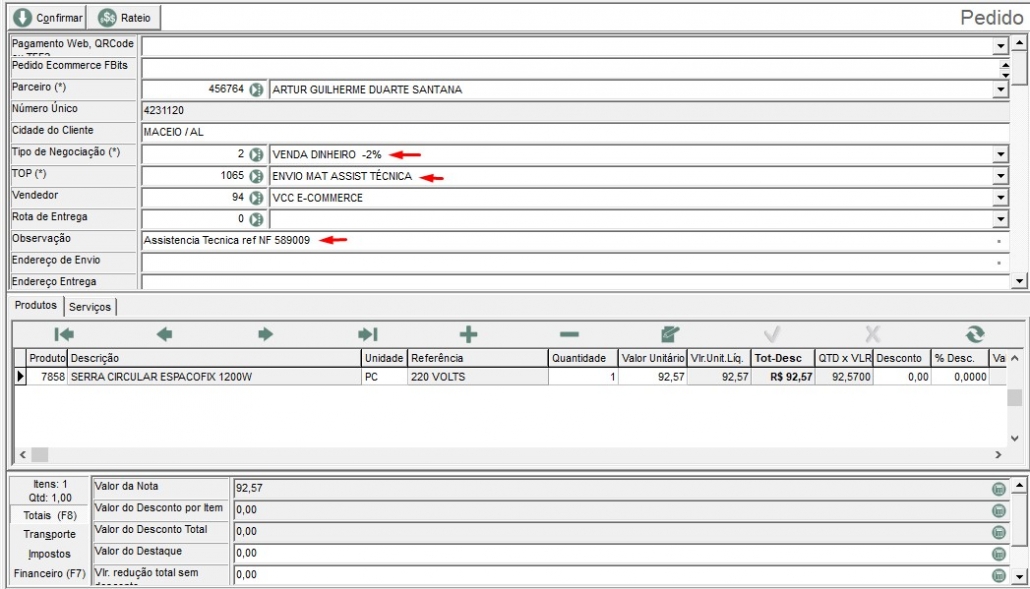 Tipo de negociação: 2 – Venda Dinheiro