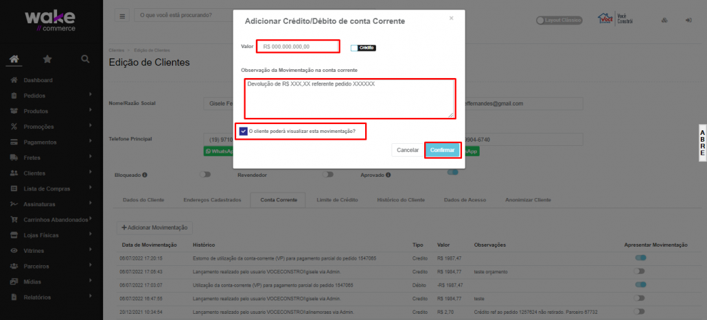Lançar crédito no Admin/Wake