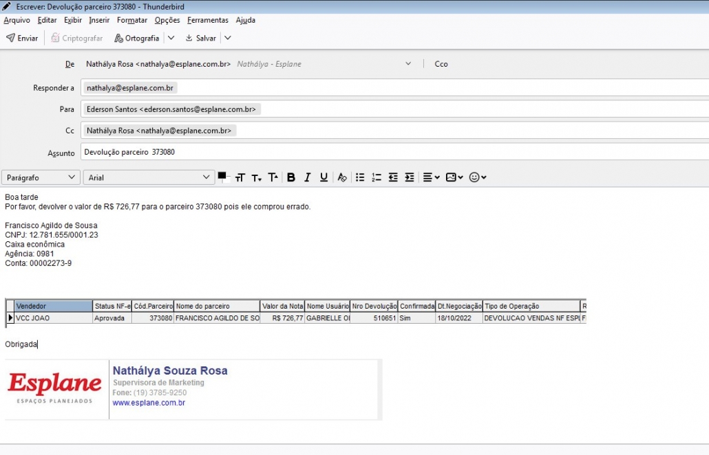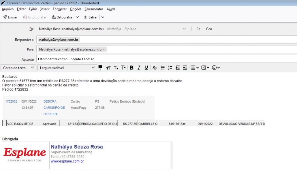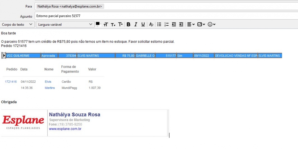 Estorno de cartão de crédito, parcial ou não, quem solicita é a Nathálya e na ausência dela, é o Eder do financeiro. Sendo assim, nesse caso, verificar o valor de crédito do cliente e enviar por e-mail para a Nathálya fazer o cancelamento parcial: