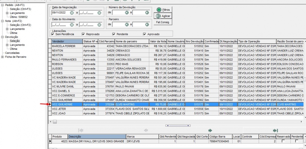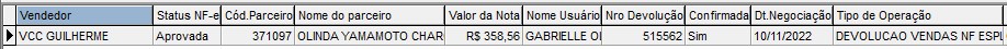 Nessa tela, conseguirá ver o valor que o cliente tem de crédito em “valor da nota” e no campo “nº da devolução”, caso esteja preenchido significa que o crédito foi finalizado e já pode ser utilizado, caso esteja 0, precisa aguardar o financeiro finalizar o crédito.