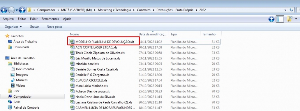 A planilha original se encontra em M:\Marketing e Tecnologia\Controles\Devoluções, os campos devem ser preenchidos e o nome da planilha deve ser o mesmo nome do cadastro do cliente, sem abreviações. Atenção, isso é um documento, então qualquer formulário feito deve ficar salvo nessa pasta e salvo corretamente, sem exceção.