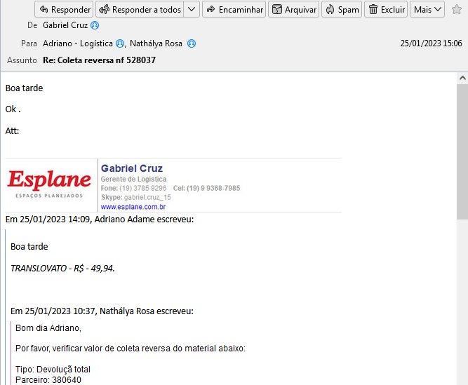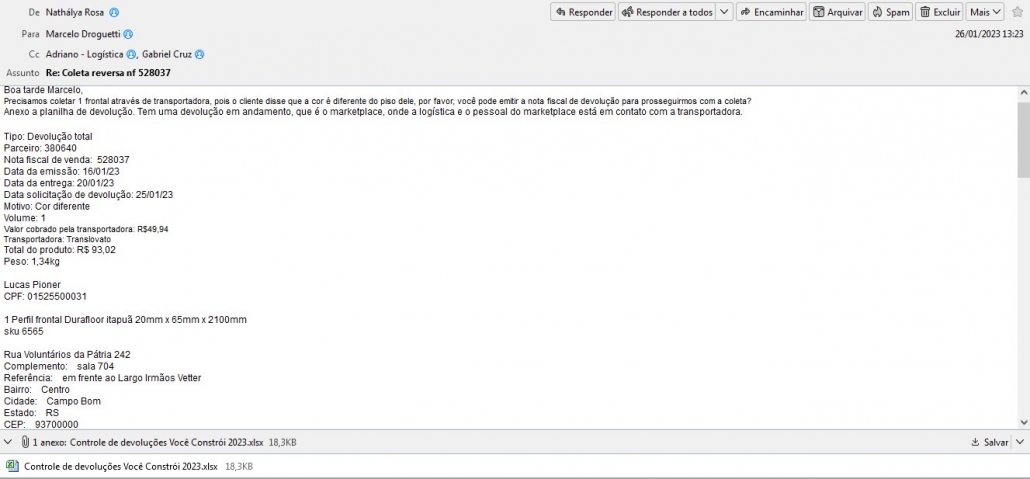 Com a autorização do Gabriel, enviar esse mesmo e-mail, para o Marcelo, colocando o Gabriel e Adriano, solicitando que o Marcelo emita a nota fiscal de devolução para a transportadora. Colocar em anexo a planilha de devolução de transportadora ( M:\Marketing e Tecnologia\Controles | “Controle de devoluções Você Constrói 2023” ) e seguir o texto abaixo, alterando o que for necessário. Quando for enviar esse e-mail, deve anexar a planilha preenchida com os dados solicitados (apenas não preencher o campo NF Dev pois deve ser preenchido após o Marcelo fazer). A planilha do controle de devoluções deve sempre estar atualizada, caso contrário, Marcelo não fará a nota, então caso a planilha não esteja atualizada, verificar quem fez por último e solicitar atualização.