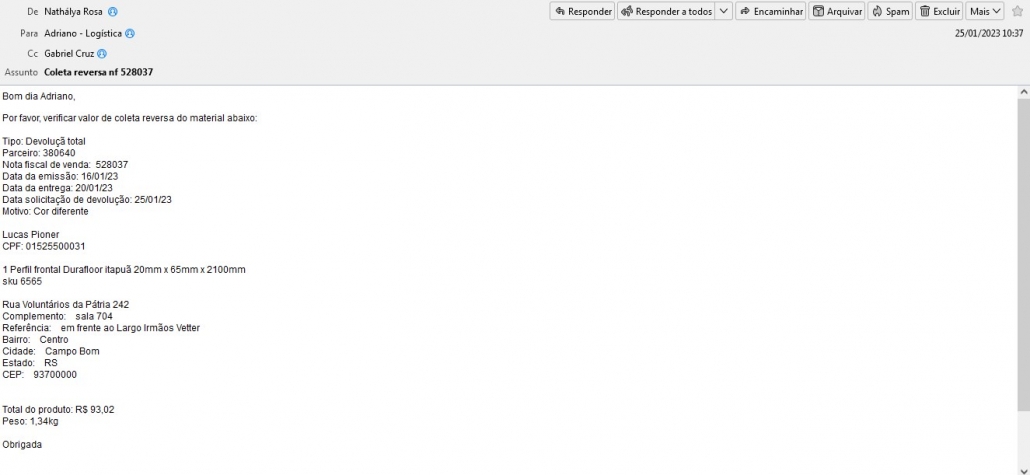 Toda coleta de pedido entregue por frota própria, deve ser preenchido um formulário, que deve ser assinado pelo Gabriel, gerente da logística e entregue na mão do Anderson (responsável pelo faturamento de pedidos).
