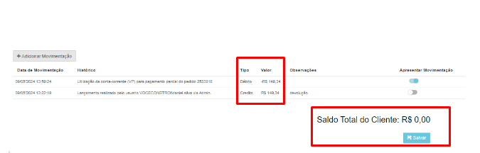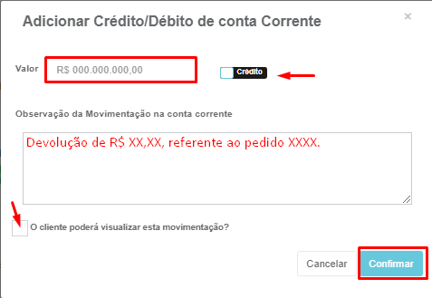Colocar o valor de crédito > escrever o motivo > clicar em ” O cliente poderá visualizar esta movimentação?” > confirmar