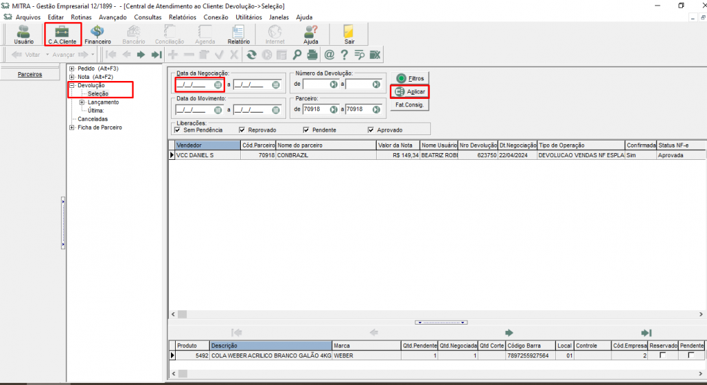 Conferir valor da devolução no mitra em: C.A. Cliente > Devolução > Seleção > colocar a data ou parceiro,(quando precisar pesquisar um cliente específico > aplicar