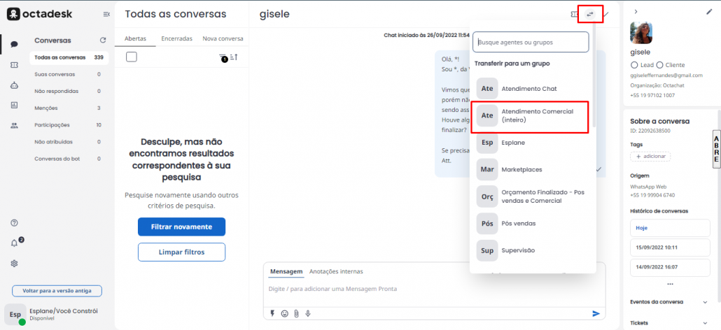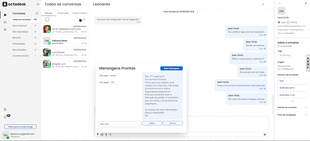 Caso cliente não tenha contato no Octa, realizar o cadastro e enviar o texto padrão, salvo no campo ‘Mensagens prontas’.