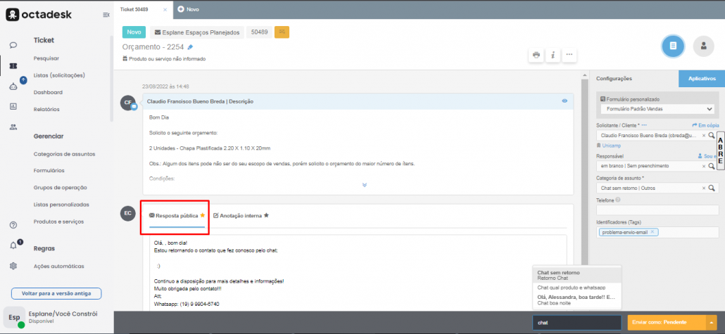 Responder sempre na aba “Resposta Publica“.