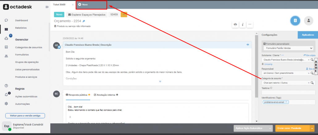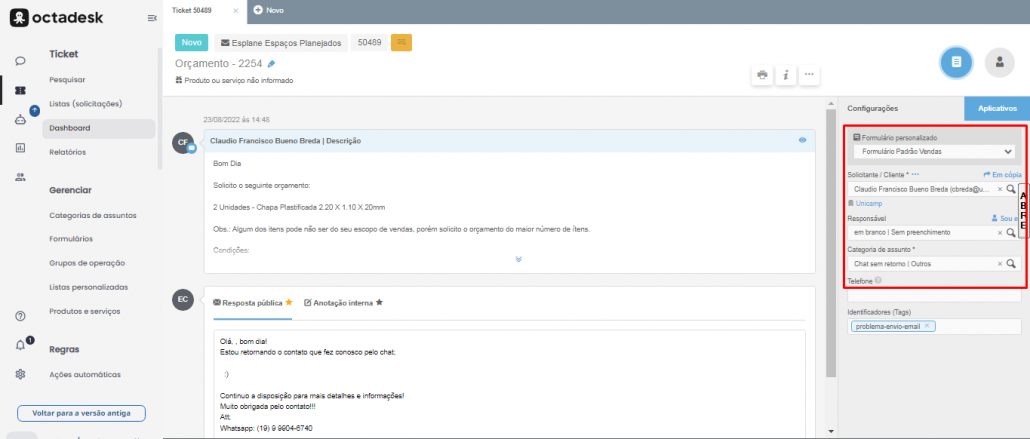 “Solicitante”: São os dados do cliente, quando a origem do Ticket for um formulário é necessário corrigir esse campo incluindo o e-mail do cliente.