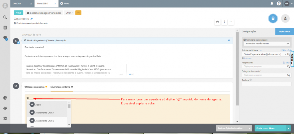 Quando um ticket for atribuído a um agente precisamos mencionar, para mencionar um agente coloque o “@” antes do nome.