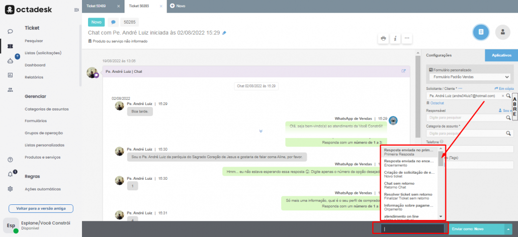 Para perguntas frequentes temos respostas prontas, em “Aplicação Automática” é possível escolher a mensagem desejada.