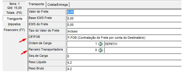 Caso o pedido seja pago e já retirado na hora, na aba Transporte: No campo “CIF/FOB” sempre alterar para F-FOB (Contratação do frete por conta do destinatário) e no campo “Parceiro Transportadora” sempre deve ser 0.