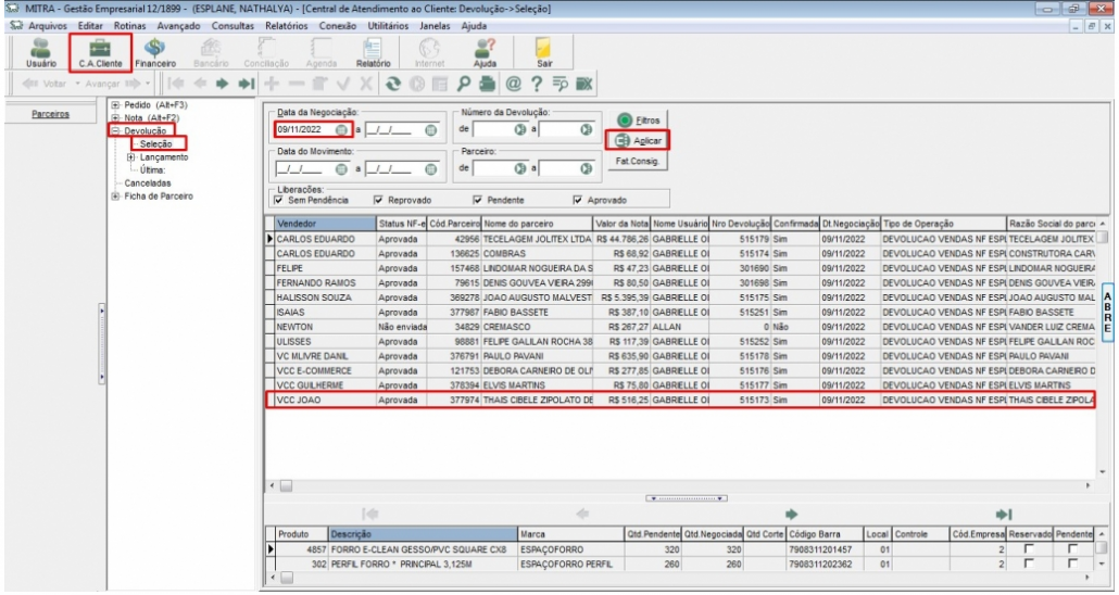 1 – Conferir valor de devolução no mitra em: C.A. Cliente > Devolução > Seleção > colocar a data > aplicar