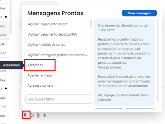 Os vendedores deverão se organizar numa escala de revezamento para, diariamente, analisarem os pedidos fechados sem atendimento e, identificando-se a oportunidade de ofertar acessórios, enviar a mensagem pronta abaixo e em seguida, finalizar a conversa sem nenhuma atribuição: