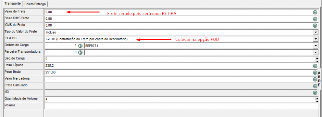 Ir na opção de transporte e incluir essas informações: