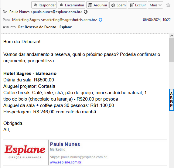 Após conseguir orçamento com 3 hotéis pelo menos, mandar um e-mail para o Vladimir com os orçamentos de cada um e pedir aprovação de qual será hotel para prosseguir com a reserva. Recebendo aprovação, comunicar o hotel que daremos andamento e qual seria o próximo passo para reservarmos a sala. Segue o exemplo: