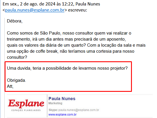 Lembrete: È sempre importante perguntar se é possível levarmos nosso projetor, pois temos um próprio para levar nos treinamentos, seria desnecessário alugar o do hotel, só se caso não for permitido levar equipamentos de fora.