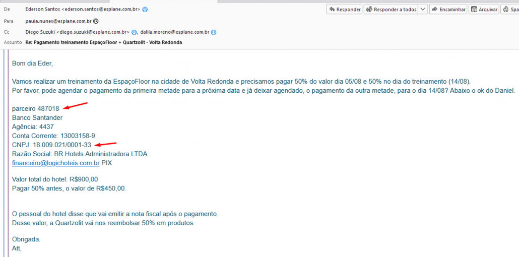 Enviar um e-mail para o Eder (ederson.santos@esplane.com.br) para agendar o pagamento do valor do hotel, explicar o motivo do pagamento, em anexo o “OK” do Daniel, as informações do dia que tem que ser pago, os dados bancários do destinatário e antes mesmo de enviar o e-mail precisamos cadastrar o hotel em nosso sistema. Para isso, é só enviar o CNPJ para o pessoal do cadastro para que elas cadastrem o numero do parceiro em nosso sistema e assim enviar no e-mail para o Eder, segue o exemplo:
