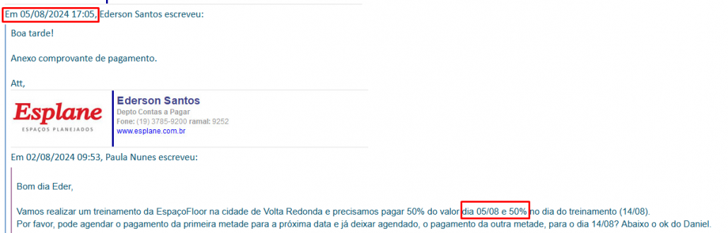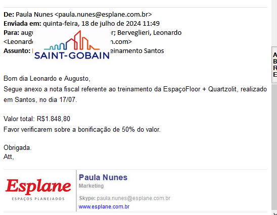 Temos que enviar um e-mail para > Leonardo.Berveglieri@saint-gobain.com < com o Augusto em cópia (augusto.neto@esplane.com.br), com o anexo da nota fiscal que recebeu do hotel também e normalmente envio a solicitação dois dias depois do treinamento. Segue o exemplo: